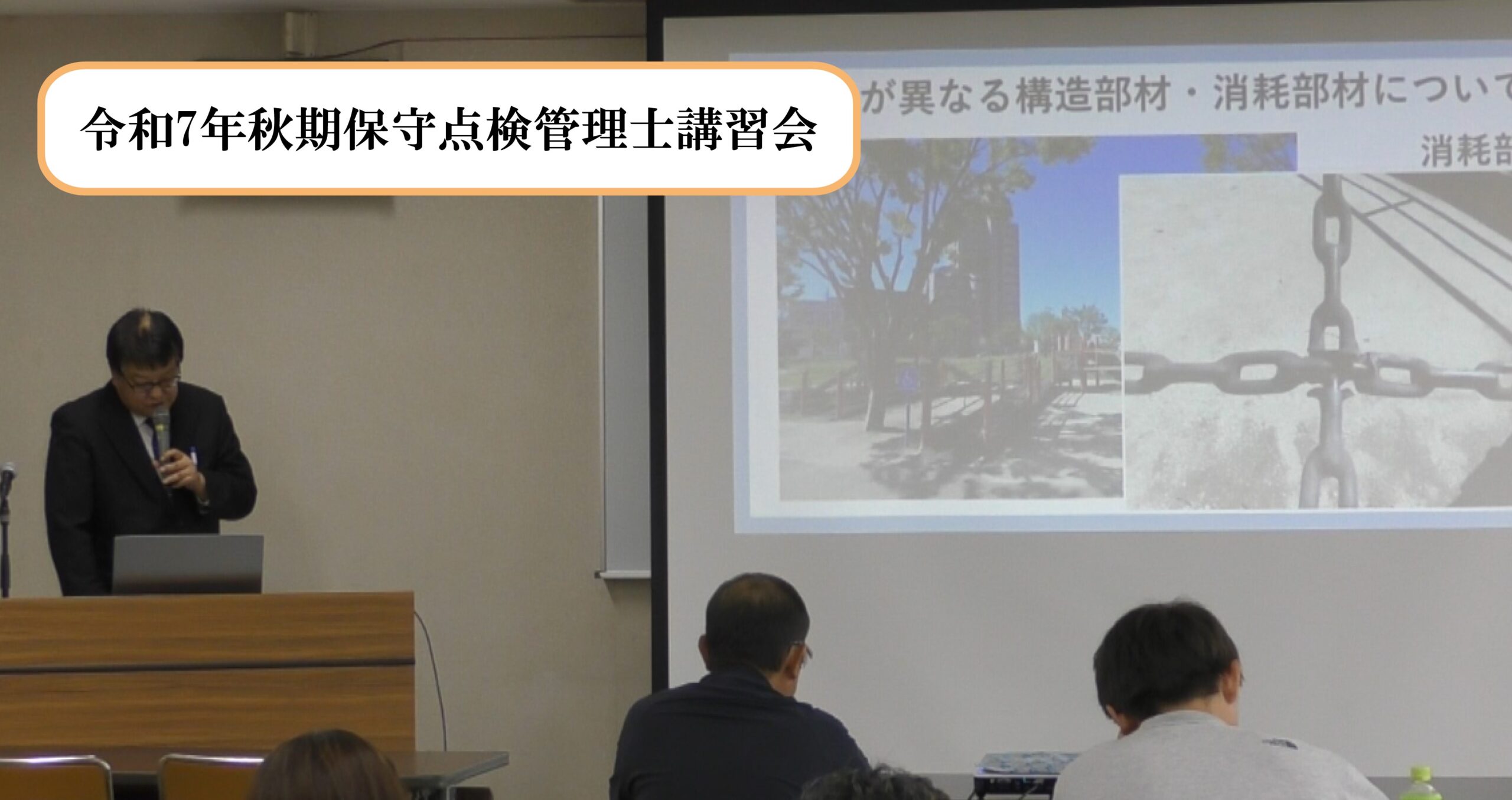 講習会について 令和7年度秋期技士講習会(2025/10/18) 令和7年10月18日 愛知県岡崎市内の施設で、管理士講習会を行いました。 会員の皆様、公共施設保守点検管理士資格取得の為、熱心に受講されました。 代表理事挨拶 事故事例研究 公園施設(遊具)に係る法令・指針 公園(遊具)の材料等に関する知識 業務管理に関する知識① 業務管理に関する知識② 令和7年度春期技士講習会(2025/6/7)